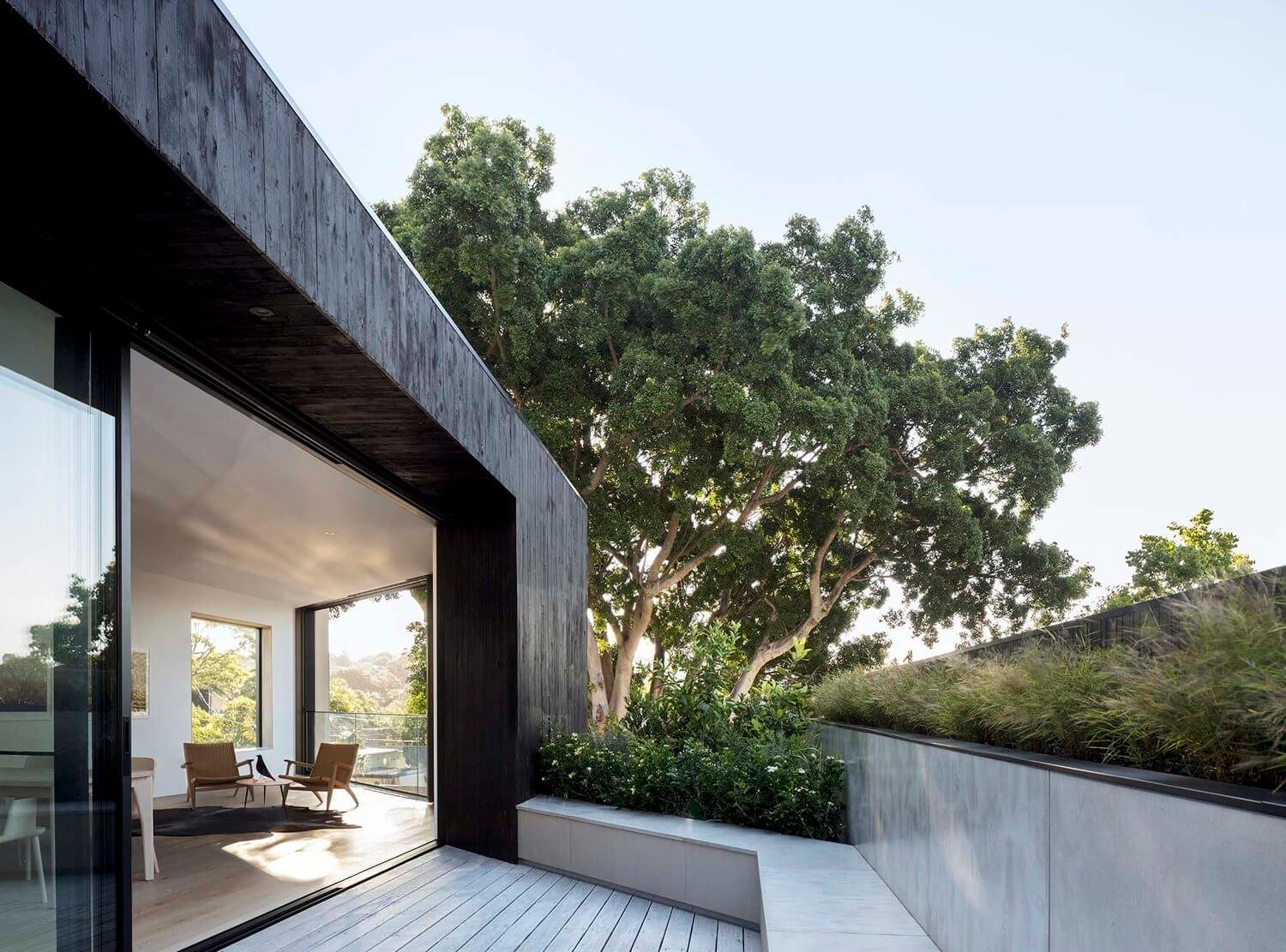 A new elevated living platform brings light, air and space to a home in Sydney’s east - offering views of the surrounding tree canopy and city beyond.